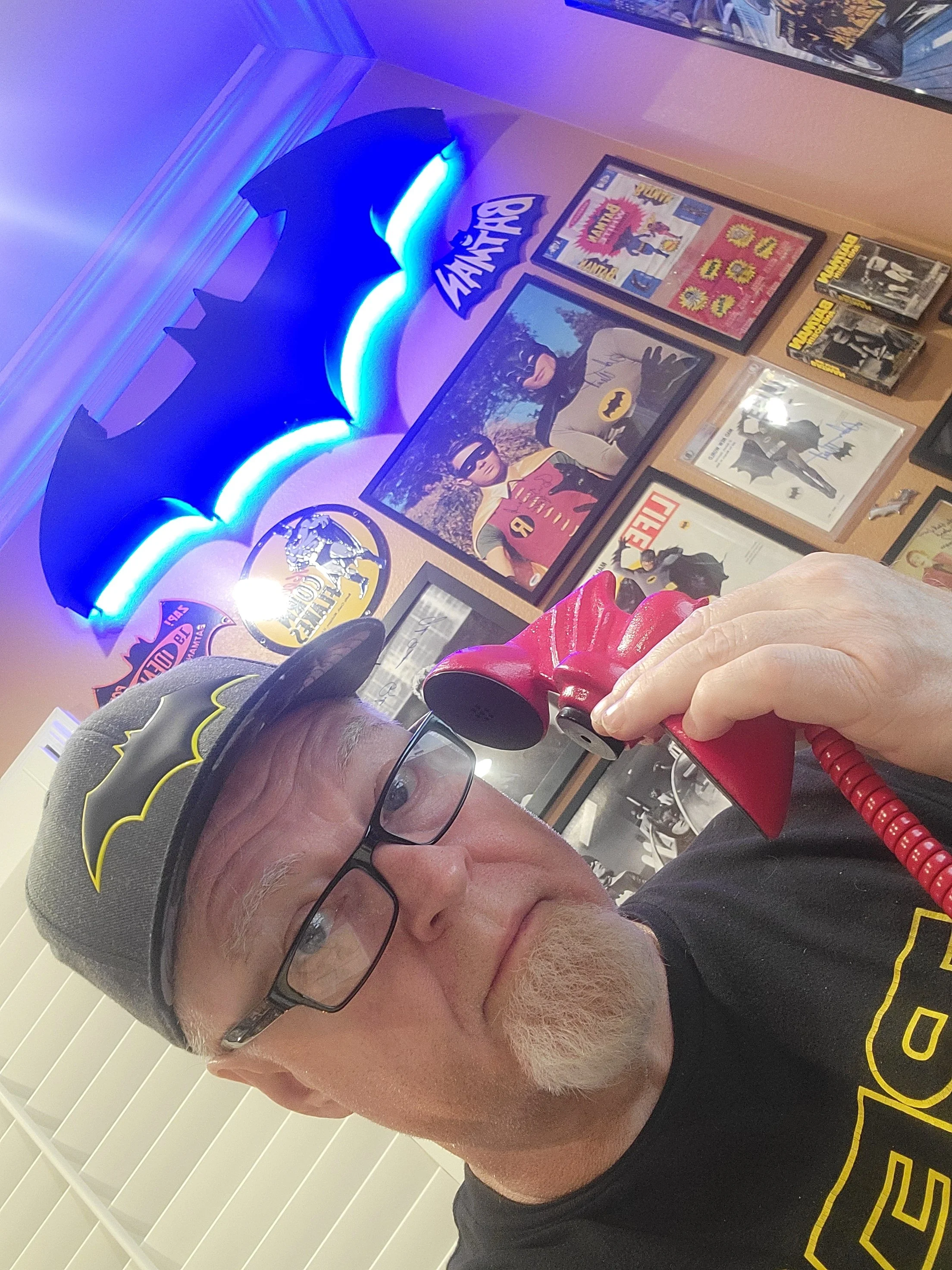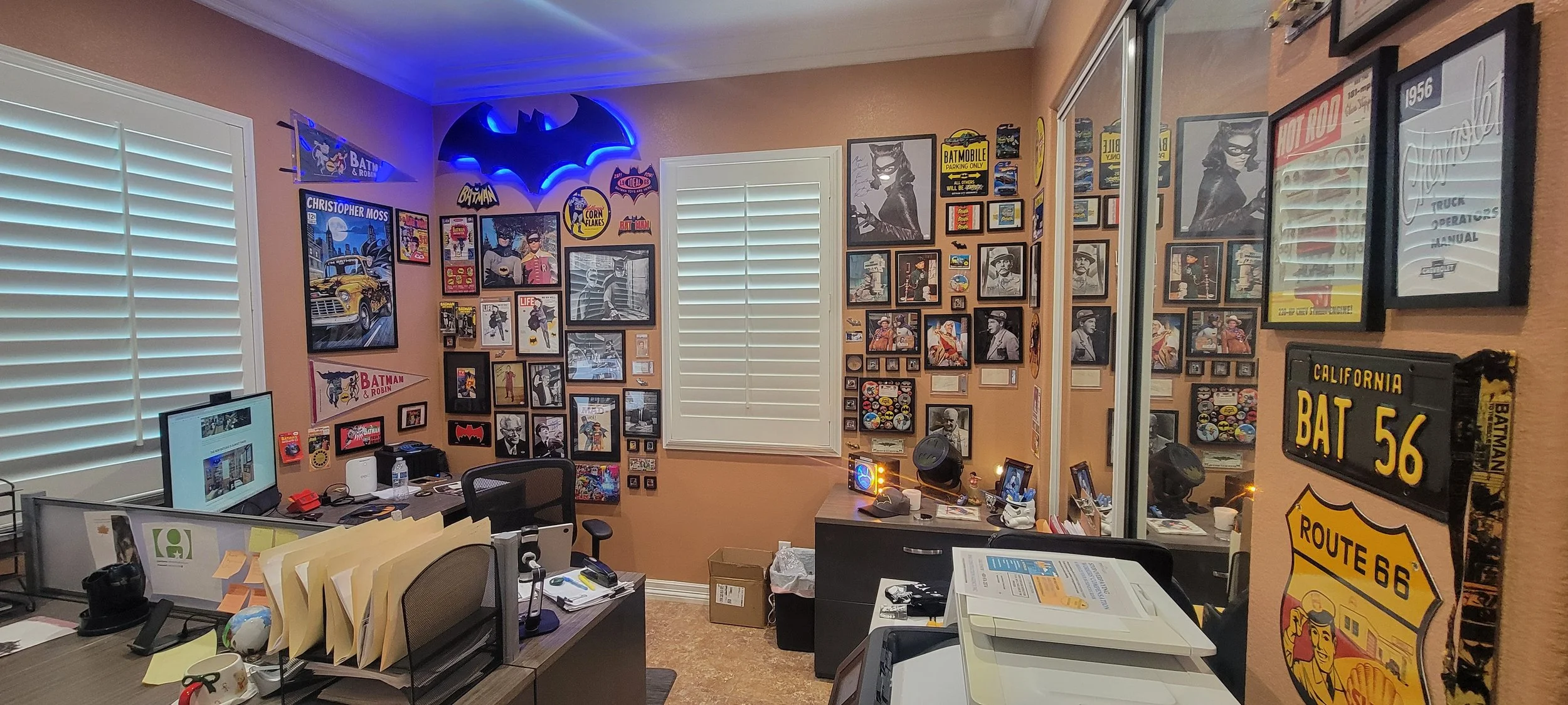 Since the closure of that company on 6/30/25, I sold everything, taking only the Bat symbol back to our home office so I could remember how it used to look. That being said… you guys know me, I had to re-collect pieces from the 1966 Batman era and added many hard-to-find Batman memorabilia back to the walls. Here’s what the home office looks like today.